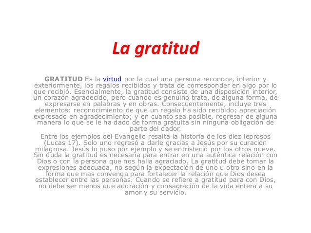 El término gratitud proviene del latín gratitudo que a su vez proviene de dos términos más. Definición de gratitud en el Diccionario de español en línea. El estudio sistemático de la gratitud dentro de la psicología no comenzó hasta aproximadamente.