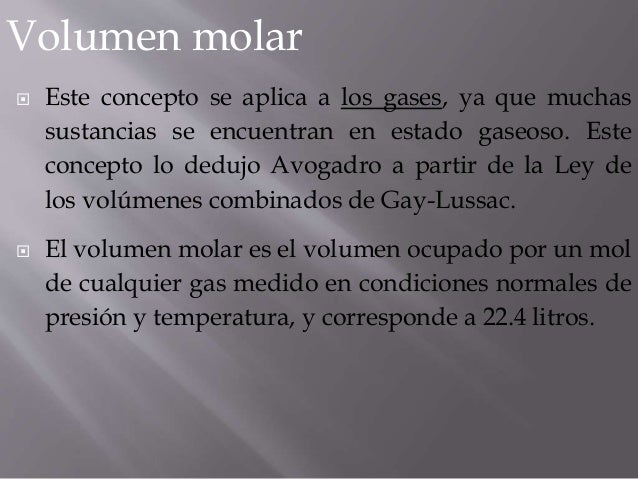 Publicado el 10 de abril de 2012 por quimica1univia. El concepto de volumen molar es muy útil Pues Permite calcular el Peso molecular de un gas por un sencillo razonamiento en sentido inverso hallando cuánto pesan 224 l de dicho gas en condiciones normales. Hipótesis de Avogadro 4.